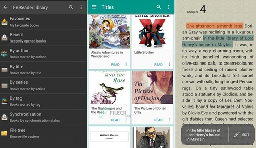 FBReader hızlıdır ve son derece özelleştirilebilir. Harici TrueType/OpenType yazı tiplerini ve özel arka planları kullanabilir, okurken ekran parlaklığını ayarlayabilir (parmağınızı ekranın sol kenarı boyunca yukarı/aşağı kaydırın) ve farklı gündüz/gece renk şemalarını seçebilir.
